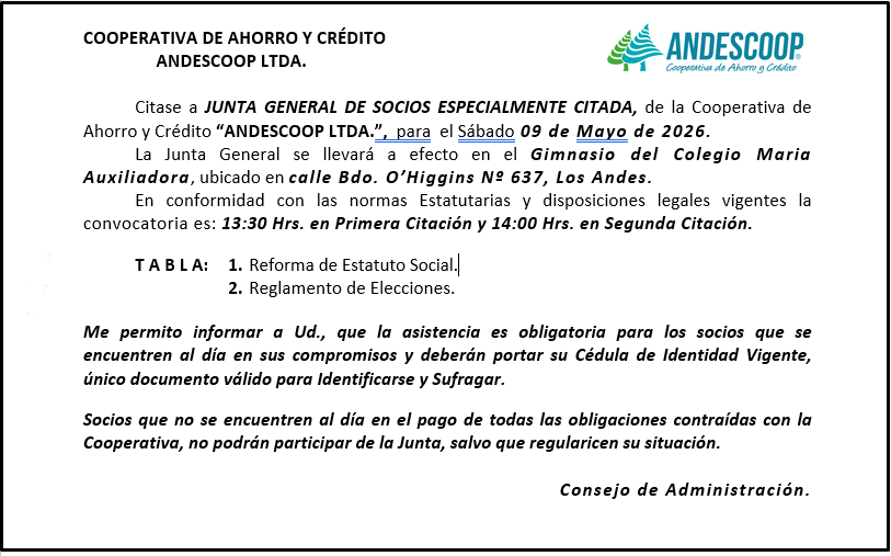 Por acuerdo del Directorio se cita a Junta Ordinaria de Accionistas a celebrarse el día 28 de Abril de 2026 a las 20:00, en las dependencias de la Sociedad ubicadas en Las Heras 650, comuna y provincia de Los Andes, la que se desarrollará de manera presencial, para tratar las siguientes materias.