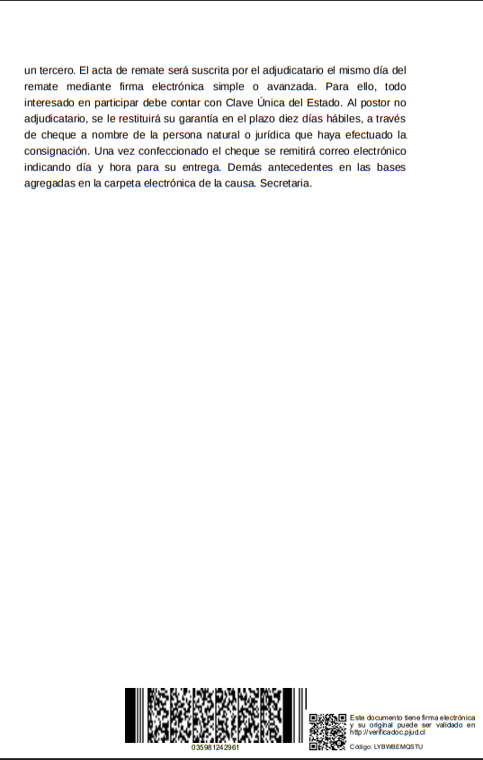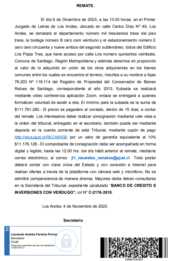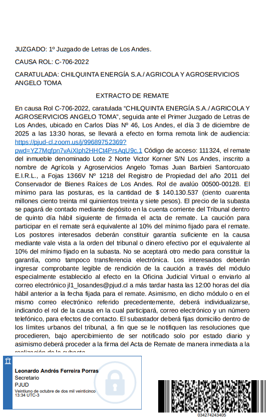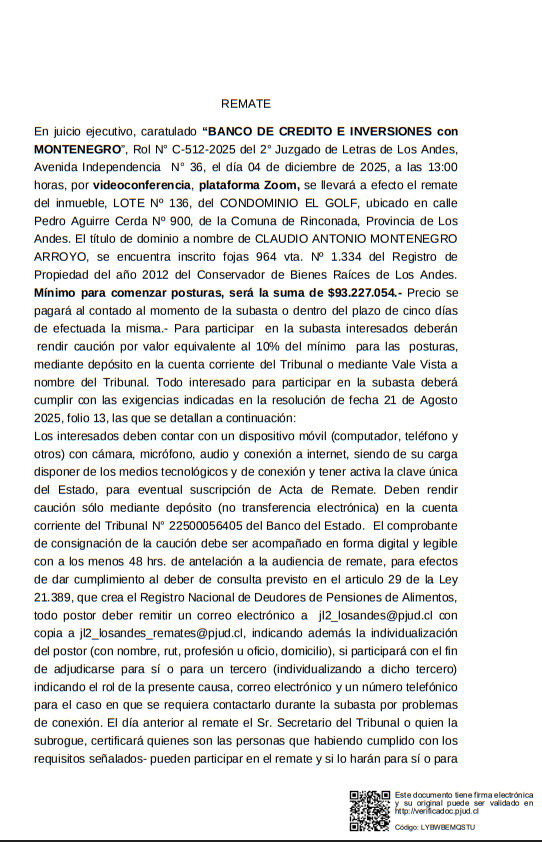Remate. Ante el Segundo Juzgado Letras de Los Andes, ubicado en Av. Independencia 36, se subastará mediante videoconferencia a través de la plataforma Zoom, link de enlace, https://pjud-cl.zoom.us/j/97600178248?pwd=SMPeavtsH6Yb0HKco5bAlixTjL8u6d.1. ID de reunión: 97600178248 Código de acceso: 738441, el día 05 de diciembre de 2025, a las 13:00 horas, el LOTE NUMERO TRES resultante de la subdivisión de la Hijuela C, ubicada en la Comuna de Calle Larga, Provincia de Los Andes, individualizado en el plano que se encuentra agregado bajo el N° 1.071 al final del Registro de Propiedad del año 2009, a mi cargo, de una superficie de ochocientos cuarenta y ocho coma seis metros cuadrados. La propiedad se encuentra inscrita a nombre del demandado a Fs.2005 N°2530 del Registro de Propiedad de 2015 del Conservador de Bienes Raíces de Los Andes. El mínimo para las posturas será la suma de $22.089.829. Precio pagadero al contado dentro de quinto día hábil desde la fecha del remate. Para tener derecho a participar en la subasta y hacer posturas, los interesados deberán rendir caución por un valor equivalente al 10% del mínimo establecido para la subasta. La caución fijada deber ser consignada en la cuenta corriente de este Tribunal, mediante depósito en caja con cupón de pago (NO TRANSFERENCIA ELECTRÓNICA) bajo los siguientes datos: Segundo Juzgado del Letras de Los Andes. - Cuenta Corriente Banco del Estado N° 22500056405 - R.U.T. 60.305.014-2, para obtener cupón de pago ingresar a: http://reca.pjud.cl/RECAWEB/. El comprobante de consignación de la caución debe ser acompañado con a los menos 48 hrs. de antelación a la audiencia de remate, en la forma establecida en el artículo 6 del acta 263-2021, esto es, mediante el módulo especialmente establecido al efecto en la Oficina Judicial Virtual, individualizándose el postor en dicho módulo e indicando el rol de la causa en la cual participar, correo electrónico y un número telefónico para el caso en que se requiera contactarlo durante la subasta. Para efectos de dar cumplimiento al deber de consulta previsto en el artículo 29 de la Ley 21.389, que crea el Registro Nacional de Deudores de Pensiones de Alimentos, todo postor deber remitir un correo electrónico jl2_losandes@pjud.cl con copia a jl2_losandes_remates@pjud.cl , en la oportunidad en la que acompaña el comprobante de caución, individualizarse con su nombre, rut, profesión u oficio, domicilio y, señalar además, sí participara en el remate con el fin de adjudicarse para sí o para un tercero, en este último caso deber consignar el nombre, rut, profesión u oficio y domicilio del tercero.. Demás información en el juicio. Causa Rol C-2059-2023, caratulada COOPERATIVA DE AHORRO Y CREDITO COOPEUCH/CONCHA. Juicio Ejecutivo. El secretario. |