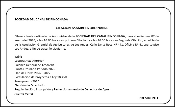Citase a Junta ordinaria de Accionistas de la SOCIEDAD DEL CANAL RINCONADA, para el miércoles 07 de enero del 2026, a las 16:00 horas en primera Citación y a las 16:30 horas en Segunda Citación, en el Salón de la Asociación Gremial de Agricultores de Los Andes, Calle Santa Rosa Nº 441, Oficina Nº 41 cuarto piso Los Andes, a fin de tratar lo siguiente: