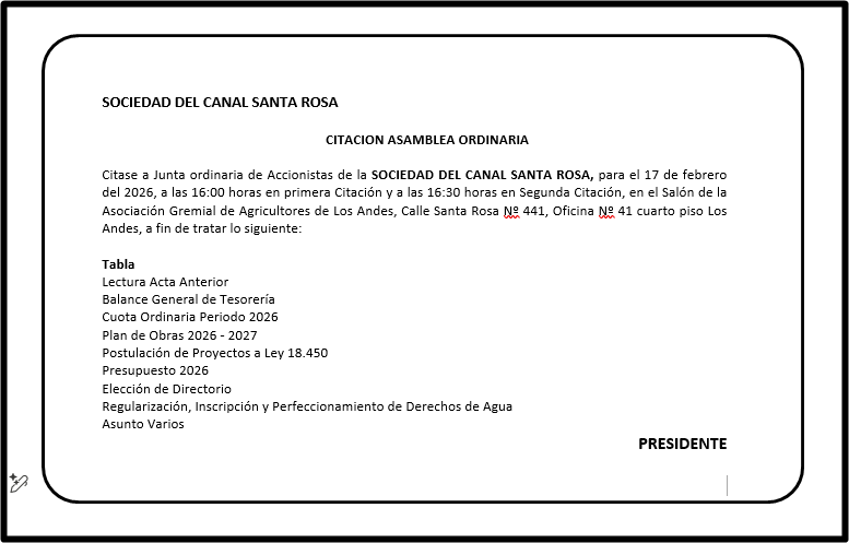 Citase a Junta ordinaria de Accionistas de la SOCIEDAD DEL CANAL SANTA ROSA, para el 17 de febrero del 2026, a las 16:00 horas en primera Citación y a las 16:30 horas en Segunda Citación, en el Salón de la Asociación Gremial de Agricultores de Los Andes, Calle Santa Rosa Nº 441, Oficina Nº 41 cuarto piso Los Andes, a fin de tratar lo siguiente: