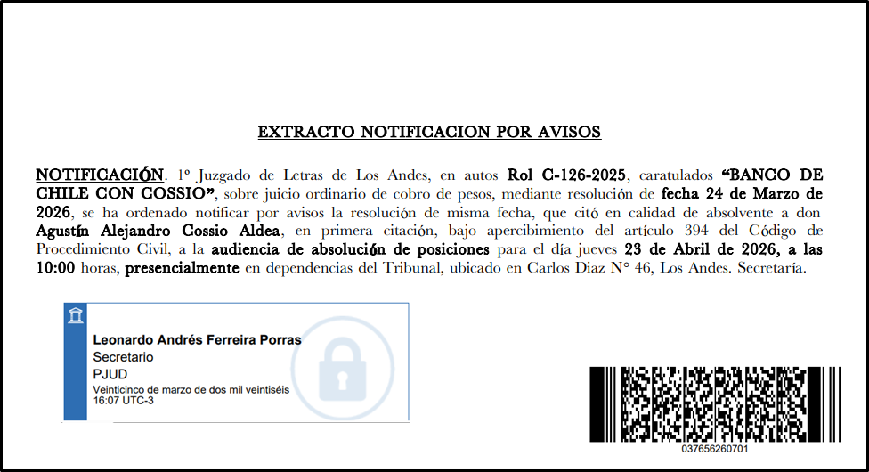 CHILE CON COSSIO”, sobre juicio ordinario de cobro de pesos, mediante resolución de fecha 24 de Marzo de 2026, se ha ordenado notificar por avisos la resolución de misma fecha, que citó en calidad de absolvente a don Agustín Alejandro Cossio Aldea, en primera citación, bajo apercibimiento del artículo 394 del Código de Procedimiento Civil, a la audiencia de absolución de posiciones para el día jueves 23 de Abril de 2026, a las 10:00 horas, presencialmente en dependencias del Tribunal, ubicado en Carlos Diaz N° 46, Los Andes. Secretaría. |
