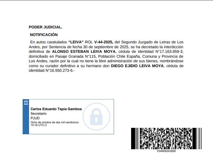 Andes, por Sentencia de fecha 30 de septiembre de 2025, se ha decretado la interdicción