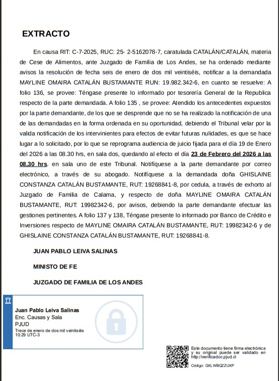 del 2026 a las 08.30 hrs, en sala dos, quedando al efecto el día 23 de Febrero del 2026 a las
