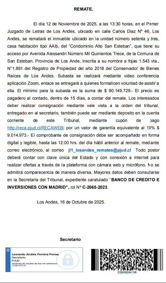 El día 12 de Noviembre de 2025, a las 13:30 horas, en el Primer Juzgado de Letras de Los Andes, ubicado en calle Carlos Diaz Nº 46, Los Andes, se rematará el inmueble ubicado en la unidad número setenta y tres, casa habitación tipo AAlb, del “Condominio Alto San Esteban”, que tiene su acceso por Avenida Alessandri Número Mil Quinientos Trece, de la Comuna de San Esteban, Provincia de Los Andes, inscrita a su nombre a fojas 1.543 vta., N°1.891 del Registro de Propiedad del año 2018 del Conservador de Bienes Raíces de Los Andes. Subasta se realizará mediante video conferencia aplicación Zoom, enlace se entregará a quienes formalicen voluntad de asistir a ella. El mínimo para la subasta es la suma de $ 90.149.729.- El precio es pagadero al contado, dentro de 15 días, a contar del remate. Los interesados deber realizar consignación mediante vale vista a la orden del tribunal, entregado en al secretario, también puede ser mediante deposito en la cuenta corriente de este Tribunal, mediante cupón de pago http://reca.pjud.cl/RECAWEB/ por un valor de garantía equivalente al 10% $ 9.014.973.- El comprobante de consignación debe ser acompañado en forma digital y legible, hasta las 12:00 hrs. del día hábil anterior al remate, mediante correo electrónico, al correo jl1_losandes_remates@pjud.cl Todo postor deberá contar con clave única del Estado y con conexión a internet para realizar ofertas a través de la plataforma con cámara web y micrófono. No se admitirá comparecencia de manera diversa. Mayores datos deben consultarse en la Secretaría del Tribunal, expediente caratulado “BANCO DE CREDITO E INVERSIONES CON MADRID”, rol Nº C-2065-2023.