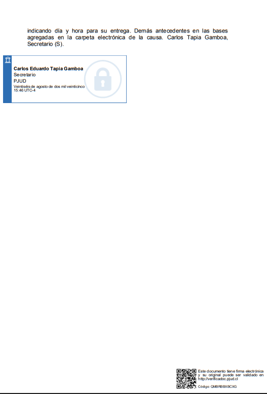 indicando día y hora para su entrega. Demás antecedentes en las bases agregadas en la carpeta electrónica de la causa. Carlos Tapia Gamboa, Secretario (S). |