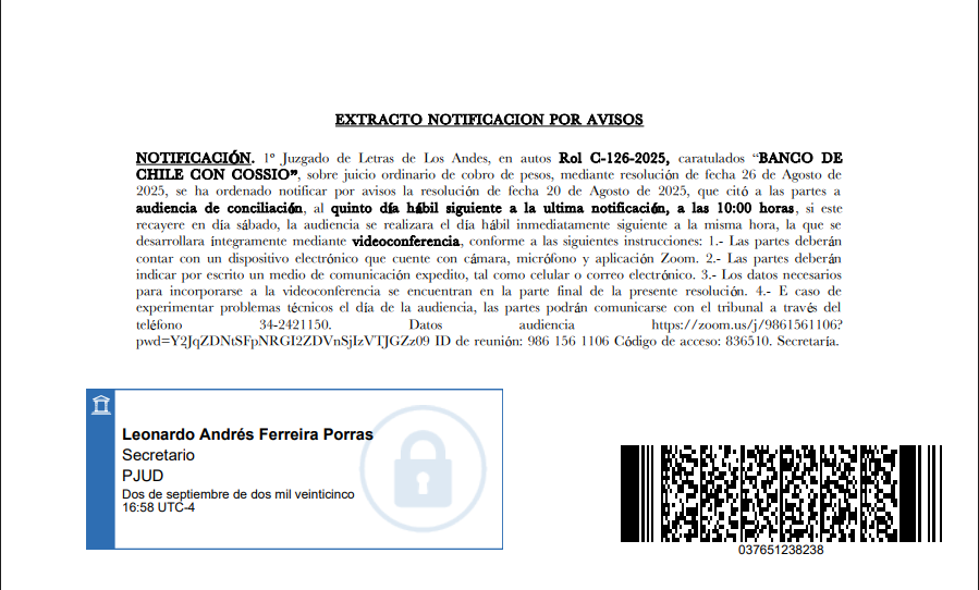 CHILE CON COSSIO”, sobre juicio ordinario de cobro de pesos, mediante resolución de fecha 26 de Agosto de 2025, se ha ordenado notificar por avisos la resolución de fecha 20 de Agosto de 2025, que citó a las partes a audiencia de conciliación, al quinto día hábil siguiente a la ultima notificación, a las 10:00 horas , si este recayere en día sábado, la audiencia se realizara el día hábil inmediatamente siguiente a la misma hora, la que se desarrollara íntegramente mediante videoconferencia, conforme a las siguientes instrucciones: 1.- Las partes deberán contar con un dispositivo electrónico que cuente con cámara, micrófono y aplicación Zoom. 2.- Las partes deberán indicar por escrito un medio de comunicación expedito, tal como celular o correo electrónico. 3.- Los datos necesarios para incorporarse a la videoconferencia se encuentran en la parte final de la presente resolución. 4.- E caso de experimentar problemas técnicos el día de la audiencia, las partes podrán comunicarse con el tribunal a través del teléfono 34-2421150. Datos audiencia https://zoom.us/j/9861561106? pwd=Y2JqZDNtSFpNRGI2ZDVnSjIzVTJGZz09 ID de reunión: 986 156 1106 Código de acceso: 836510. Secretaría. |
