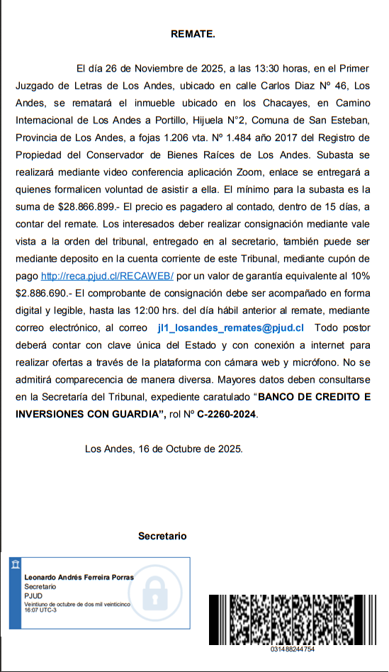 El día 26 de Noviembre de 2025, a las 13:30 horas, en el Primer Juzgado de Letras de Los Andes, ubicado en calle Carlos Diaz Nº 46, Los Andes, se rematará el inmueble ubicado en los Chacayes, en Camino Internacional de Los Andes a Portillo, Hijuela N°2, Comuna de San Esteban, Provincia de Los Andes, a fojas 1.206 vta. Nº 1.484 año 2017 del Registro de Propiedad del Conservador de Bienes Raíces de Los Andes. Subasta se realizará mediante video conferencia aplicación Zoom, enlace se entregará a quienes formalicen voluntad de asistir a ella. El mínimo para la subasta es la suma de $28.866.899.- El precio es pagadero al contado, dentro de 15 días, a contar del remate. Los interesados deber realizar consignación mediante vale vista a la orden del tribunal, entregado en al secretario, también puede ser mediante deposito en la cuenta corriente de este Tribunal, mediante cupón de pago http://reca.pjud.cl/RECAWEB/ por un valor de garantía equivalente al 10% $2.886.690.- El comprobante de consignación debe ser acompañado en forma digital y legible, hasta las 12:00 hrs. del día hábil anterior al remate, mediante correo electrónico, al correo jl1_losandes_remates@pjud.cl Todo postor deberá contar con clave única del Estado y con conexión a internet para realizar ofertas a través de la plataforma con cámara web y micrófono. No se admitirá comparecencia de manera diversa. Mayores datos deben consultarse en la Secretaría del Tribunal, expediente caratulado “BANCO DE CREDITO E INVERSIONES CON GUARDIA”, rol Nº C-2260-2024.