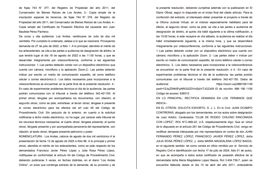 NOMENCLATURA : Los Andes, catorce de agosto de dos mil veinticinco A la presentación de fecha 12 de agosto de 2025 a folio 88. A lo principal y primer otrosí, atendido el mérito de los antecedentes, como se pide respecto de los demandados Francisco Javier Pérez López y Julia Rosa Pérez López, notifíquese en conformidad al artículo 54 del Código de Procedimiento Civil, debiendo publicarse 3 veces, en fechas distintas, en el diario “Los Andes Online”, un aviso que contenga extracto de la demanda, de su proveído y de