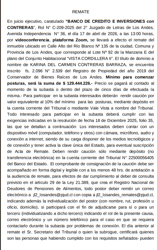 En juicio Ejecutivo, caratulado “BANCO DE CHILE CON DONOSO”, Rol Nº C-1260-2024, del 2º Juzgado de Letras de Los Andes, ubicado en calle Independencia N° 36, Los Andes, el 2 de Abril de 2026 a las 13:00 horas, se llevará a efecto el remate de la vivienda ubicada en pasaje Patricio Barros Viguera número ochocientos setenta, de la ciudad, Comuna y Provincia de Los Andes y que corresponde al LOTE NUMERO B CINCO de la MANZANA E en el plano del Conjunto Habitacional “AIRES DE ACONCAGUA”, protocolizado bajo el número 380 al final del Registro de Propiedad del año 2020 a cargo del Conservador de Bienes Raíces de Los Andes, de una superficie de ciento veintitrés coma setenta y cinco metros cuadrados, inscrita a fs. 372 vuelta N° 441 del Registro de Propiedad del año 2021 del Conservador de Bienes Raíces de Los Andes. Rol de Avaluó N° 720-104 de la