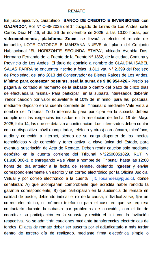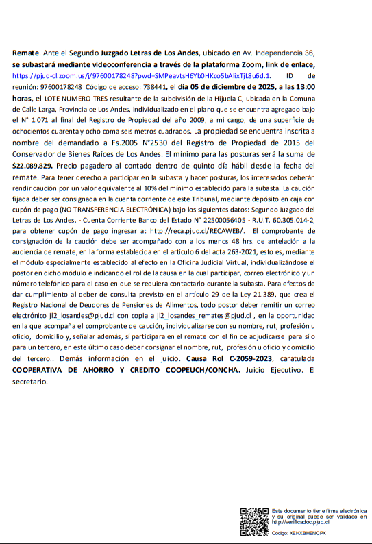 Remate. Ante el Segundo Juzgado Letras de Los Andes, ubicado en Av. Independencia 36, se subastará mediante videoconferencia a través de la plataforma Zoom, link de enlace, https://pjud-cl.zoom.us/j/97600178248?pwd=SMPeavtsH6Yb0HKco5bAlixTjL8u6d.1. ID de reunión: 97600178248 Código de acceso: 738441, el día 05 de diciembre de 2025, a las 13:00 horas, el LOTE NUMERO TRES resultante de la subdivisión de la Hijuela C, ubicada en la Comuna de Calle Larga, Provincia de Los Andes, individualizado en el plano que se encuentra agregado bajo el N° 1.071 al final del Registro de Propiedad del año 2009, a mi cargo, de una superficie de ochocientos cuarenta y ocho coma seis metros cuadrados. La propiedad se encuentra inscrita a nombre del demandado a Fs.2005 N°2530 del Registro de Propiedad de 2015 del Conservador de Bienes Raíces de Los Andes. El mínimo para las posturas será la suma de $22.089.829. Precio pagadero al contado dentro de quinto día hábil desde la fecha del remate. Para tener derecho a participar en la subasta y hacer posturas, los interesados deberán rendir caución por un valor equivalente al 10% del mínimo establecido para la subasta. La caución fijada deber ser consignada en la cuenta corriente de este Tribunal, mediante depósito en caja con cupón de pago (NO TRANSFERENCIA ELECTRÓNICA) bajo los siguientes datos: Segundo Juzgado del Letras de Los Andes. - Cuenta Corriente Banco del Estado N° 22500056405 - R.U.T. 60.305.014-2, para obtener cupón de pago ingresar a: http://reca.pjud.cl/RECAWEB/. El comprobante de consignación de la caución debe ser acompañado con a los menos 48 hrs. de antelación a la audiencia de remate, en la forma establecida en el artículo 6 del acta 263-2021, esto es, mediante el módulo especialmente establecido al efecto en la Oficina Judicial Virtual, individualizándose el postor en dicho módulo e indicando el rol de la causa en la cual participar, correo electrónico y un número telefónico para el caso en que se requiera contactarlo durante la subasta. Para efectos de dar cumplimiento al deber de consulta previsto en el artículo 29 de la Ley 21.389, que crea el Registro Nacional de Deudores de Pensiones de Alimentos, todo postor deber remitir un correo electrónico jl2_losandes@pjud.cl con copia a jl2_losandes_remates@pjud.cl , en la oportunidad en la que acompaña el comprobante de caución, individualizarse con su nombre, rut, profesión u oficio, domicilio y, señalar además, sí participara en el remate con el fin de adjudicarse para sí o para un tercero, en este último caso deber consignar el nombre, rut, profesión u oficio y domicilio del tercero.. Demás información en el juicio. Causa Rol C-2059-2023, caratulada COOPERATIVA DE AHORRO Y CREDITO COOPEUCH/CONCHA. Juicio Ejecutivo. El secretario. |