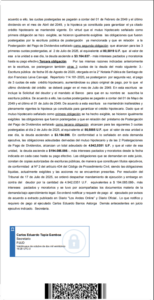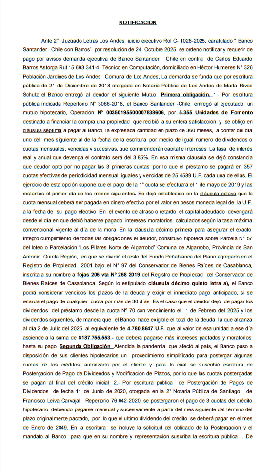 Ante 2° Juzgado Letras Los Andes, juicio ejecutivo Rol C- 1028-2025, caratulado " Banco Santander Chile con Barros” por resolución de 24 Octubre 2025, se ordenó notificar y requerir de pago por avisos demanda ejecutiva de Banco Santander Chile en contra de Carlos Eduardo Barros Astorga Rut 15.693.341-4, Técnico en Computación, domiciliado en Héctor Humeres N° 326 Población Jardines de Los Andes, Comuna de Los Andes, La demanda se funda que por escritura pública de 21 de Diciembre de 2018 otorgada en Notaria Pública de Los Andes de Marta Rivas Schulz el Banco entregó al deudor el siguiente Mutuo: Primera obligación. 1.- Por escritura pública indicada Repertorio N° 3066-2018, el Banco Santander -Chile, entregó al ejecutado, un mutuo hipotecario, Operación Nº 00350195500007838606, por 5.355 Unidades de Fomento destinado a financiar la compra una propiedad que recibió a su entera satisfacción, y se obligó en cláusula séptima a pagar al Banco, la expresada cantidad en plazo de 360 meses, a contar del día uno del mes siguiente al de la fecha de la escritura, por medio de igual número de dividendos o cuotas mensuales, vencidas y sucesivas, que comprenderán capital e intereses. La tasa de interés real y anual que devenga el contrato será del 3,85%. En esa misma clausula se dejó constancia que deudor optó por no pagar las 3 primeras cuotas, por lo que el préstamo se pagará en 357 cuotas efectivas de periodicidad mensual, iguales y vencidas de 25,4589 U.F. cada una de ellas. El ejercicio de esta opción supone que el pago de la 1° cuota se efectuará el 1 de mayo de 2019 y las restantes el primer día de los meses siguientes. Se dejó establecido en la cláusula octavo que la cuota mensual deberá ser pagada en dinero efectivo por el valor en pesos moneda legal de la U.F. a la fecha de su pago efectivo. En el evento de atraso o retardo, el capital adeudado devengará desde el día en que debió haberse pagado, intereses moratorios calculados según la tasa máxima convencional vigente al día de la mora. En la cláusula décimo primera para asegurar el exacto, íntegro cumplimiento de todas las obligaciones el deudor, constituyó hipoteca sobre Parcela N° 57 del loteo o Parcelación “Los Pilares Norte de Algarrobo” Comuna de Algarrobo, Provincia de San Antonio, Quinta Región, en que se dividió el resto del Fundo Peñablanca del Plano agregado en el Registro de Propiedad 2001 bajo el N° 97 del Conservador de Bienes Raíces de Casablanca, inscrita a su nombre a fojas 205 vta Nº 258 2019 del Registro de Propiedad del Conservador de Bienes Raíces de Casablanca. Según lo estipulado cláusula décimo quinto letra a), el Banco podrá considerar vencidos los plazos de la deuda y exigir el inmediato pago anticipado, si se retarda el pago de cualquier cuota por más de 30 días. Es el caso que el deudor dejó de pagar los dividendos del préstamo desde la cuota Nº 70 con vencimiento el 1 de Febrero del 2025 y los dividendos siguientes, de manera que, el Banco, hace exigible el total de la deuda, la que alcanza al día 2 de Julio del 2025, al equivalente de 4.780,8647 U.F. que al valor de esa unidad a ese día asciende a la suma de $187.755.553.- que deberá pagarse más intereses pactados y moratorios, hasta su pago. Segunda Obligación Atendida la pandemia, que afectó al país, el Banco puso a disposición de sus clientes hipotecarios un procedimiento simplificado para postergar algunas cuotas de los créditos, autorizado por el cliente y para lo cual se suscribió escritura de Postergación de Pago de Dividendos y Modificación de Plazos, por lo que las cuotas postergadas se pagan al final del crédito inicial. 2.- Por escritura pública de Postergación de Pagos de Dividendos de fecha 11 de Junio de 2020, otorgada en la 2° Notaria Pública de Santiago de Francisco Leiva Carvajal, Repertorio 76.642-2020, se postergaron el pago de 3 cuotas del crédito hipotecario, debiendo pagarse mensual y sucesivamente a partir del mes siguiente del término del plazo originalmente pactado, por lo que el ultimo dividendo del crédito se deberá pagar en el mes de Enero de 2049. En la escritura se incluye la solicitud del obligado de la Postergación y el mandato al Banco para que en su nombre y representación suscriba la escritura pública . De acuerdo a ello, las cuotas postergadas se pagarán a contar del 01 de Febrero de 2049 y el último dividendo en el mes de Abril del 2049, y la hipoteca ya constituida para garantizar el ya citado crédito hipotecario se mantendrá vigente. En virtud que el mutuo hipotecario señalado como primera obligación se hizo exigible, se hicieron igualmente exigibles las obligaciones que fueron postergadas por la escritura pública de postergación ya mencionada y que en relación a la Postergación del Pago de Dividendos señalado como segunda obligación que alcanzan para las 3 primeras cuotas postergadas, al 2 de Julio de 2025, al equivalente al 80,5819 U.F. que al valor de esa a la unidad a ese día, la deuda asciende a $3.164.637.- más intereses pactados y moratorios hasta su pago efectivo Tercera obligación Por las mismas razones indicadas anteriormente en la escritura, se postergaron también otras 3 cuotas de la deuda del modo siguiente: 3.- Escritura pública de fecha 05 de Agosto de 2020, otorgada en la 2° Notaria Pública de Santiago de don Francisco Leiva Carvajal, Repertorio 114.161-2020, se postergaron por segunda vez, el pago de 3 cuotas de este crédito hipotecario, aumentándose su plazo original de pago, por lo que el ultimo dividendo del crédito se deberá pagar en el mes de Julio de 2049. En esta escritura se incluye la Solicitud del deudor y el mandato al Banco para que en su nombre se suscriba la escritura pública. De acuerdo a ello, las cuotas postergadas se pagarán a contar del 01 de Mayo de 2049 y el último el 01 de Julio de 2049. De acuerdo a esta escritura se mantendrán inalterables y plenamente vigentes l