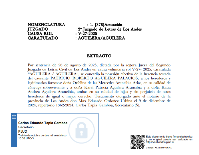 Por sentencia de 26 de agosto de 2025, dictada por la señora Jueza del Segundo Juzgado de Letras Civil de Los Andes en causa voluntaria rol V-27- 2025, caratulada “AGUILERA / AGUILERA”, se concedió la posesión efectiva de la herencia testada del causante PATRICIO ROBERTO AGUILERA PALACIOS, a los herederos y legitimarios forzosos: doña Orfelina de las Mercedes Arancibia Arias, en su calidad de cónyuge sobreviviente y a doña Karel Patricia Aguilera Arancibia y a doña Katia Andrea Aguilera Arancibia, ambas en su calidad de hijas y sin perjuicio de otros herederos de igual o mejor derecho. Testamento otorgado ante el notario de la provincia de Los Andes don Max Eduardo Ordoñez Urbina el 9 de diciembre de 2024, repertorio 1362-2024. Carlos Tapia Gamboa, Secreatario (S). |