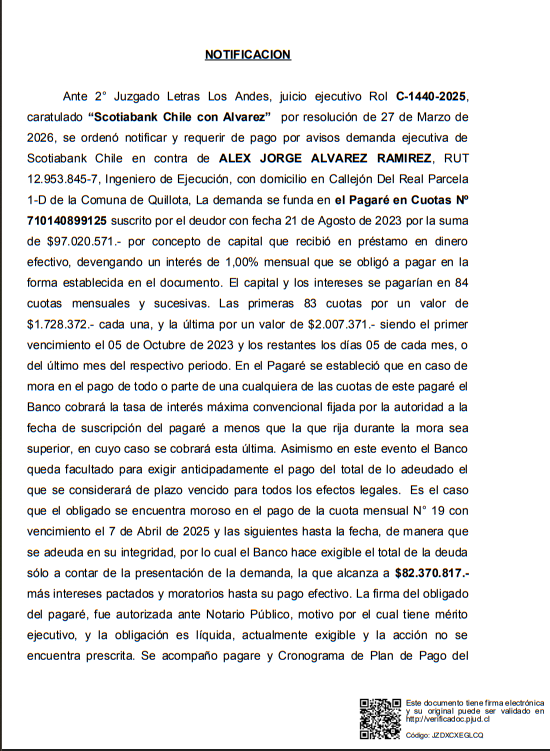 CHILE CON COSSIO”, sobre juicio ordinario de cobro de pesos, mediante resolución de fecha 24 de Marzo de 2026, se ha ordenado notificar por avisos la resolución de misma fecha, que citó en calidad de absolvente a don Agustín Alejandro Cossio Aldea, en primera citación, bajo apercibimiento del artículo 394 del Código de Procedimiento Civil, a la audiencia de absolución de posiciones para el día jueves 23 de Abril de 2026, a las 10:00 horas, presencialmente en dependencias del Tribunal, ubicado en Carlos Diaz N° 46, Los Andes. Secretaría. |