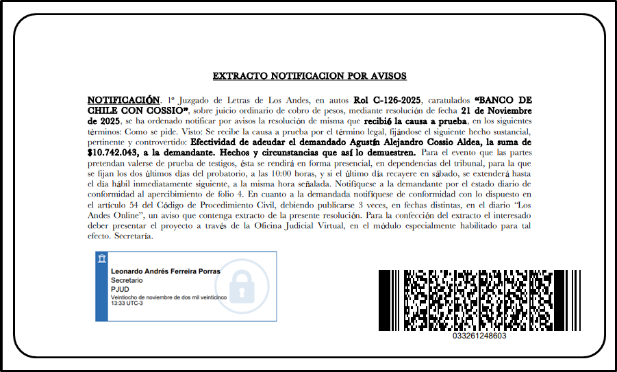 CHILE CON COSSIO”, sobre juicio ordinario de cobro de pesos, mediante resolución de fecha 21 de Noviembre de 2025, se ha ordenado notificar por avisos la resolución de misma que recibió la causa a prueba, en los siguientes términos: Como se pide. Visto: Se recibe la causa a prueba por el término legal, fijándose el siguiente hecho sustancial, pertinente y controvertido: Efectividad de adeudar el demandado Agustín Alejandro Cossio Aldea, la suma de