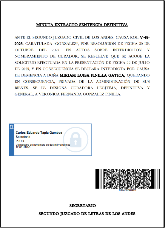 OCTUBRE DEL 2025, EN AUTOS SOBRE INTERDICCION Y NOMBRAMIENTO DE CURADOR, SE RESUELVE QUE SE ACOGE LA SOLICITUD EFECTUADA EN LA PRESENTACIÓN DE FECHA 22 DE JULIO DE 2025, Y EN CONSECUENCIA SE DECLARA INTERDICTA POR CAUSA DE DEMENCIA A DOÑA MIRIAM LUISA PINILLA GATICA, QUEDANDO EN CONSECUENCIA, PRIVADA DE LA ADMINISTRACIÓN DE SUS BIENES. SE LE DESIGNA CURADORA LEGÍTIMA, DEFINITIVA Y GENERAL, A VERONICA FERNANDA GONZALEZ PINILLA. |