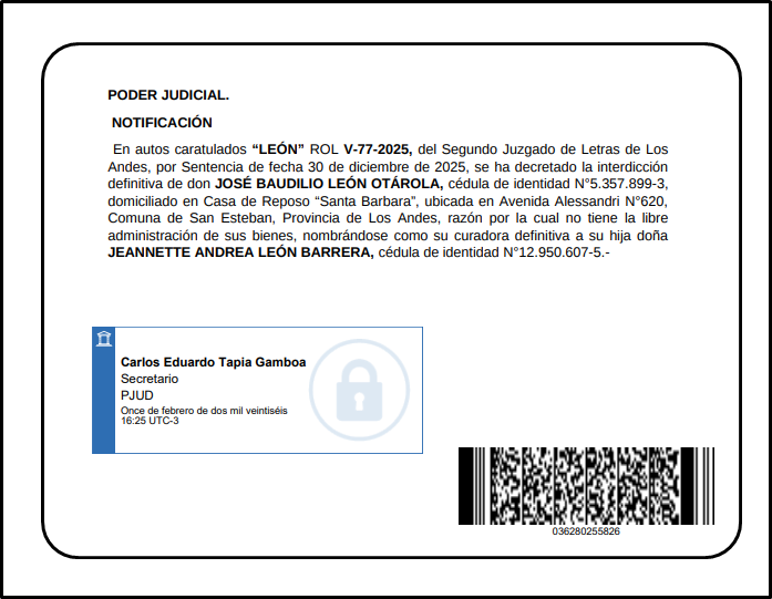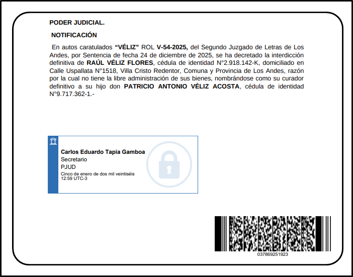 Andes, por Sentencia de fecha 30 de diciembre de 2025, se ha decretado la interdicción