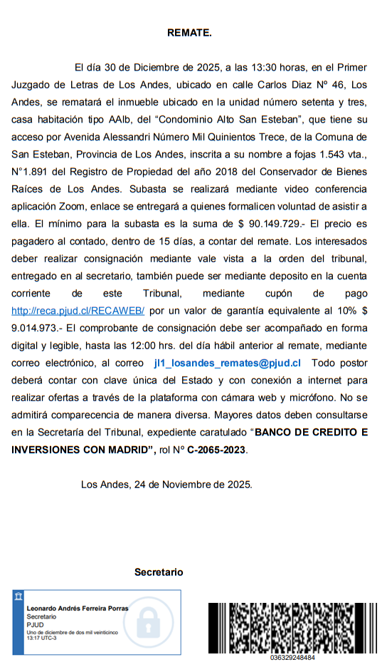de 2025 a las 13:00 horas, se llevará a efecto el remate del Inmueble ubicado en Pasaje Daniel Milanez Número Mil Ochocientos Sesenta y Ocho, de la ciudad, Comuna y Provincia de Los Andes, individualizado como LOTE NUMERO ONCE de la MANZANA C en el plano del Conjunto