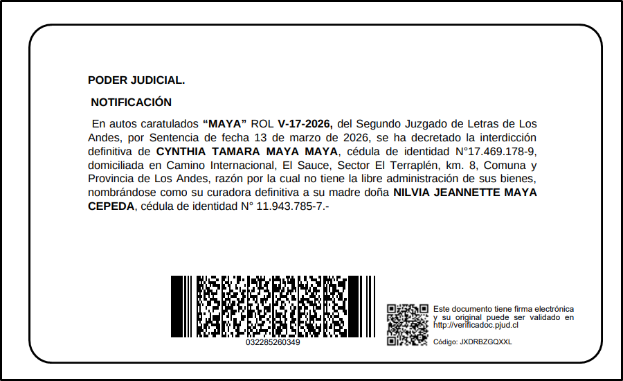 Andes, por Sentencia de fecha 13 de marzo de 2026, se ha decretado la interdicción