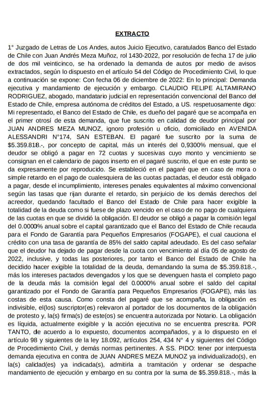 Ante el Primer Juzgado de Letras de Los Andes, ubicado en Avenida Carlos Diaz N°46, de la Comuna de Los Andes, se rematará el día 10 de marzo de 2026 a las 13:30 horas, de forma telemática y mediante plataforma Zoom, mediante el siguiente enlace: https://pjud-cl.zoom.us/j/96342571059?pwd=pfJlgX7fkSv90b9VI8xxeWmd4G5Rhj.1 conforme las siguientes credenciales ID: 963 4257 1059, Código de acceso: 526209, el inmueble consistente en Lote N°5, resultante de la subdivisión del Lote 1-A, del predio rústico denominado El Llano, ubicado en el sector de Campos de Ahumada, de la comuna de San Esteban, provincia de Los Andes, Región de Valparaíso, de una superficie aproximada de 5.719,58 metros cuadrados, encerrado en el polígono 5C-5B-2B-2C-5D-5E-5C y que tiene los siguientes deslindes especiales: Al NORPONIENTE, en 93,22 metros con Lote Siete de la misma subdivisión; al NORORIENTE, en 52,92 metros con Lote Dos de la subdivisión, servidumbre de tránsito de por medio; AL SURPONIENTE en 64,77 metros con deslinde general del plano; SURORIENTE, en 102,39 metros con Lote Tres de la subdivisión. La propiedad se encuentra inscrita a nombre del demandado a Fojas 1411 vta., Número 1795 del Registro de Propiedad del año 2016, del Conservador de Bienes Raíces de Los Andes. El mínimo para comenzar las posturas será la suma correspondiente al avalúo vigente del inmueble embargado o la fecha en que se verifique el remate, cuyo avalúo actualmente corresponde a $12.062.599.-, según certificado de avalúo vigente al segundo semestre de 2025. El precio del remate deberá pagarse al contado, mediante depósito en la cuenta corriente bancaria del Tribunal, dentro de quinto día de efectuado el remate. El remate se realizará mediante videoconferencia, a través de la plataforma Zoom; siendo responsabilidad de cada compareciente contar con los dispositivos electrónicos que le permitan participar en forma remota. Todo postor para tener derecho a hacer posturas en la subasta deberá rendir caución equivalente al 10% del precio mínimo fijado para la subasta. La caución podrá ser consignada únicamente de una de las siguientes formas: a) Mediante vale vista a la orden del tribunal, entregado en la secretaría. b) Mediante depósito en la cuenta corriente del tribunal, Banco del Estado N°22500051829, RUT N°61.918.000-3, utilizando al efecto el cupón de pago del Banco Estado, ingresando a la dirección http://reca.pjud.cl/RECAWEB. No se admitirán cauciones mediante transferencias electrónicas de fondos. El comprobante de consignación de la caución debe ser acompañado únicamente a través de la Oficina Judicial Virtual, portal “Remates”. Una vez acompañado, se deberá remitir un correo electrónico a la dirección jl1_losandes_remates@pjud.cl indicando en el asunto “POSTOR REMATE”, en el texto los datos de la causa y el nombre, RUT y teléfono del postor, quién deberá señalar si comparecerá por sí, o bien, en representación de un tercero, en cuyo caso deberá indicar igualmente el nombre y RUT de este. Previo al remate, la Sra. Secretaria del tribunal –o quien la subrogue efectuar la revisión del Registro Nacional de Deudores de Pensiones Alimenticias, respecto de todos los postores, para dar cumplimiento al artículo 29 inciso quinto de la Ley 21.389; y certificar los postores que habiendo cumplido con los requisitos, pueden participar en la subasta. Al postor no adjudicatario que haya pagado su caución mediante cupón de pago del Banco Estado, se le restituirá su garantía dentro del plazo de quince días hábiles, mediante cheque nominativo. Para los postores que hayan pagado su caución mediante vale vista, su devolución se efectuará a contar del mismo día de la subasta. Bases y antecedentes, autos Ejecutivos, Rol C-421-2025, caratulados “Cooperativa de Ahorro y Crédito Coopeuch/ Sandoval”. |