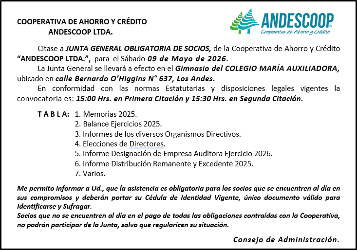 Citase a JUNTA GENERAL OBLIGATORIA DE SOCIOS, de la Cooperativa de Ahorro y Crédito “ANDESCOOP LTDA.”, para el Sábado 09 de Mayo de 2026. La Junta General se llevará a efecto en el Gimnasio del COLEGIO MARÍA AUXILIADORA, ubicado en calle Bernardo O’Higgins N° 637, Los Andes. En conformidad con las normas Estatutarias y disposiciones legales vigentes la convocatoria es: 15:00 Hrs. en Primera Citación y 15:30 Hrs. en Segunda Citación. T A B L A: 1. Memorias 2025. 2. Balance Ejercicios 2025. 3. Informes de los diversos Organismos Directivos. 4. Elecciones de Directores. 5. Informe Designación de Empresa Auditora Ejercicio 2026. 6. Informe Distribución Remanente y Excedente 2025. 7. Varios. Me permito informar a Ud., que la asistencia es obligatoria para los socios que se encuentren al día en sus compromisos y deberán portar su Cédula de Identidad Vigente, único documento válido para Identificarse y Sufragar. Socios que no se encuentren al día en el pago de todas las obligaciones contraídas con la Cooperativa, no podrán participar de la Junta, salvo que regularicen su situación. Consejo de Administración.