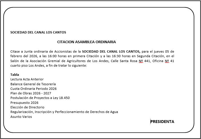 Citase a Junta ordinaria de Accionistas de la SOCIEDAD DEL CANAL LOS CANTOS, para el jueves 05 de febrero del 2026, a las 16:00 horas en primera Citación y a las 16:30 horas en Segunda Citación, en el Salón de la Asociación Gremial de Agricultores de Los Andes, Calle Santa Rosa Nº 441, Oficina Nº 41 cuarto piso Los Andes, a fin de tratar lo siguiente:
