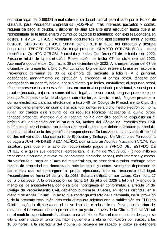 comisión legal del 0.0000% anual sobre el saldo del capital garantizado por el Fondo de Garantía para Pequeños Empresarios (FOGAPE), más intereses pactados y costas, requerir de pago al deudor, y disponer se siga adelante esta ejecución hasta que a mi representada se le haga entero y cumplido pago de lo adeudado, con expresa condena en costas. PRIMER OTROSÍ: Acompaña documentos bajo apercibimiento legal y solicita custodia. SEGUNDO OTROSÍ: Señala bienes para la traba del embargo y designa depositario. TERCER OTROSÍ: Se tenga presente. CUARTO OTROSÍ: Señala correo electrónico. QUINTO OTROSÍ: Patrocinio y poder. Con fecha 07 de diciembre de 2022: Pospone inicio de la tramitación. Presentación de fecha 07 de diciembre de 2022: Acompaña documentos. Con fecha 09 de diciembre de 2022: A la presentación del 07 de diciembre del presente, a folio 3. Por cumplido lo ordenado, estese a lo que se resolverá: Proveyendo demanda del 06 de diciembre del presente, a folio 1. A lo principal, despáchese mandamiento de ejecución y embargo; al primer otrosí, téngase por acompañado un pagaré, bajo el apercibimiento que indica, custódiese; al segundo otrosí, téngase presente los bienes señalados, en cuanto al depositario provisional, se designa al propio ejecutado, bajo su responsabilidad legal; al tercer otrosí, téngase presente y por acompañada personería de abogado, con citación; al cuarto otrosí, téngase presente el correo electrónico para los efectos del artículo 49 del Código de Procedimiento Civil. Sin perjuicio de lo anterior, en cuanto a la solicitud notificarse a dicho medio electrónico, no ha lugar, por carecer este tribunal de los recursos técnicos necesarios; al quinto otrosí, téngase presente. Atendido que el litigante no fijó domicilio según lo dispuesto en el artículo 49, en relación con el artículo 53, ambos del Código de Procedimiento Civil, notifíquesele por el estado diario todas las resoluciones que deban notificarse por cédula, mientras no efectúe la designación correspondiente.- En Los Andes, a nueve de diciembre de dos mil veintidós: Mandamiento de Ejecución y Embargo. Un Ministro de Fe requerirá de pago a JUAN ANDRES MEZA MUÑOZ, domiciliado en Avenida Alessandri N°174, San Esteban, para que en el acto del requerimiento pague a BANCO DEL ESTADO DE CHILE, o a quien sus derechos representen, la suma de $5.359.818.- (cinco millones trescientos cincuenta y nueve mil ochocientos dieciocho pesos), más intereses y costas. No verificado el pago en el acto del requerimiento, se procederá a trabar embargo sobre bienes de propiedad del demandado, más intereses y costas. Nombrase depositario de los bienes que se embarguen al propio ejecutado, bajo su responsabilidad legal. Presentación de fecha 14 de julio de 2025: Solicita notificación por avisos. Con fecha 17 de julio de 2025: A la presentación de fecha 14 de julio de 2025 a folio 54. Atendido el mérito de los antecedentes, como se pide, notifíquese en conformidad al artículo 54 del Código de Procedimiento Civil, debiendo publicarse 3 veces, en fechas distintas, en el diario “Los Andes Online”, un aviso que contenga extracto de la demanda, de su proveído y de la presente resolución, debiendo cumplirse además con la publicación en El Diario Oficial, según lo dispuesto en el inciso final del citado artículo. Para la confección del extracto, el interesado deberá presentar el proyecto a través de la Oficina Judicial Virtual, en el módulo especialmente habilitado para tal efecto. Para el requerimiento de pago, se cita al demandado al tercer día hábil siguiente a la última notificación por avisos, a las 10:00 horas, a la secretaría del tribunal, si recayere en sábado el plazo se extenderá