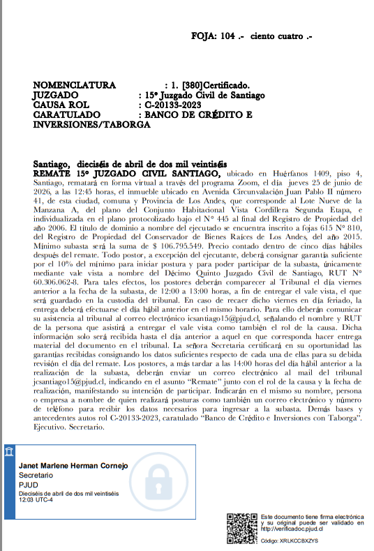 Santiago, dieciséis de abril de dos mil veintiséis REMATE 15° JUZGADO CIVIL SANTIAGO, ubicado en Huérfanos 1409, piso 4, Santiago, rematará en forma virtual a través del programa Zoom, el día jueves 25 de junio de 2026, a las 12:45 horas, el inmueble ubicado en Avenida Circunvalación Juan Pablo II número 41, de esta ciudad, comuna y Provincia de Los Andes, que corresponde al Lote Nueve de la Manzana A, del plano del Conjunto Habitacional Vista Cordillera Segunda Etapa, e individualizada en el plano protocolizado bajo el N° 445 al final del Registro de Propiedad del año 2006. El título de dominio a nombre del ejecutado se encuentra inscrito a fojas 615 N° 810, del Registro de Propiedad del Conservador de Bienes Raíces de Los Andes, del año 2015. Mínimo subasta será la suma de $ 106.795.549. Precio contado dentro de cinco días hábiles después del remate. Todo postor, a excepción del ejecutante, deberá consignar garantía suficiente por el 10% del mínimo para iniciar postura y para poder participar de la subasta, únicamente mediante vale vista a nombre del Décimo Quinto Juzgado Civil de Santiago, RUT N° 60.306.062-8. Para tales efectos, los postores deberán comparecer al Tribunal el día viernes anterior a la fecha de la subasta, de 12:00 a 13:00 horas, a fin de entregar el vale vista, el que será guardado en la custodia del tribunal. En caso de recaer dicho viernes en día feriado, la entrega deberá efectuarse el día hábil anterior en el mismo horario. Para ello deberán comunicar su asistencia al tribunal al correo electrónico icsantiago15@pjud.cl, señalando el nombre y RUT de la persona que asistirá a entregar el vale vista como también el rol de la causa. Dicha información solo será recibida hasta el día anterior a aquel en que corresponda hacer entrega material del documento en el tribunal. La señora Secretaria certificará en su oportunidad las garantías recibidas consignando los datos suficientes respecto de cada una de ellas para su debida revisión el día del remate. Los postores, a más tardar a las 14:00 horas del día hábil anterior a la realización de la subasta, deberán enviar un correo electrónico al mail del tribunal jcsantiago15@pjud.cl, indicando en el asunto “Remate” junto con el rol de la causa y la fecha de realización, manifestando su intención de participar. Indicarán en el mismo su nombre, persona o empresa a nombre de quien realizará posturas como también un correo electrónico y número de teléfono para recibir los datos necesarios para ingresar a la subasta. Demás bases y antecedentes autos rol C-20133-2023, caratulado “Banco de Crédito e Inversiones con Taborga”. Ejecutivo. Secretario.