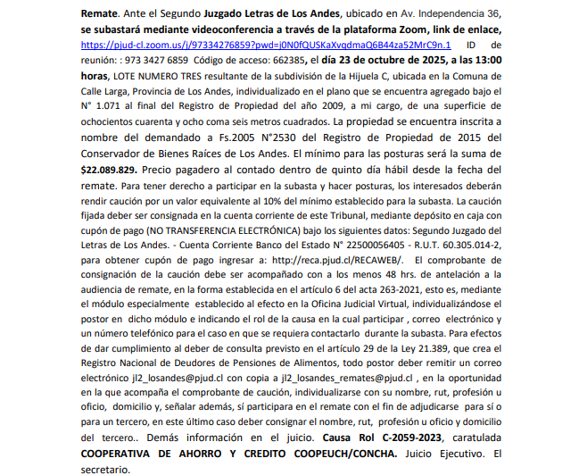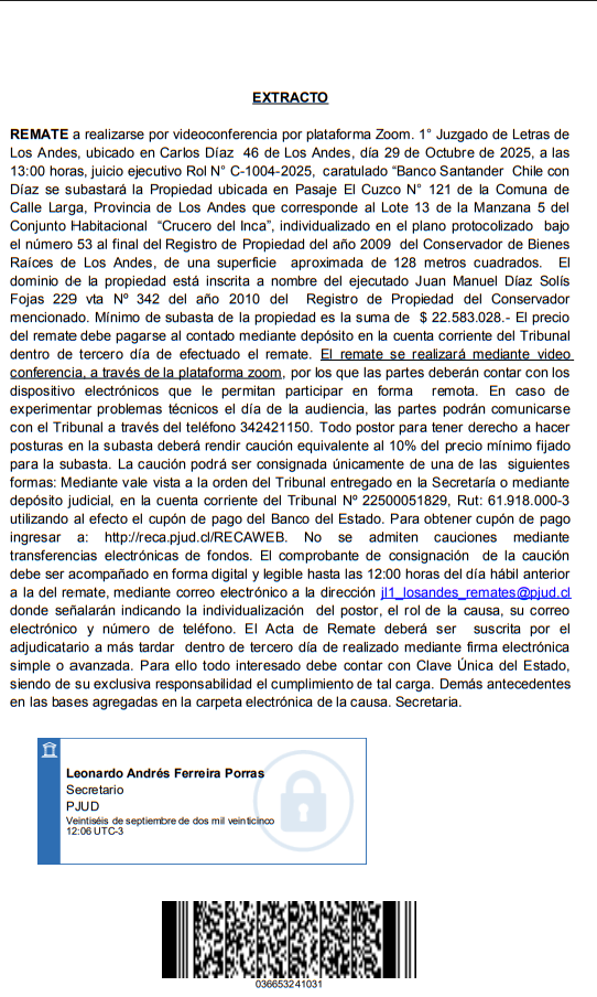 REMATE a realizarse por videoconferencia por plataforma Zoom. 1° Juzgado de Letras de Los Andes, ubicado en Carlos Díaz 46 de Los Andes, día 29 de Octubre de 2025, a las 13:00 horas, juicio ejecutivo Rol N° C-1004-2025, caratulado “Banco Santander Chile con Díaz se subastará la Propiedad ubicada en Pasaje El Cuzco N° 121 de la Comuna de Calle Larga, Provincia de Los Andes que corresponde al Lote 13 de la Manzana 5 del Conjunto Habitacional “Crucero del Inca”, individualizado en el plano protocolizado bajo el número 53 al final del Registro de Propiedad del año 2009 del Conservador de Bienes Raíces de Los Andes, de una superficie aproximada de 128 metros cuadrados. El dominio de la propiedad está inscrita a nombre del ejecutado Juan Manuel Díaz Solís Fojas 229 vta Nº 342 del año 2010 del Registro de Propiedad del Conservador mencionado. Mínimo de subasta de la propiedad es la suma de $ 22.583.028.- El precio del remate debe pagarse al contado mediante depósito en la cuenta corriente del Tribunal dentro de tercero día de efectuado el remate. El remate se realizará mediante video conferencia, a través de la plataforma zoom, por los que las partes deberán contar con los dispositivo electrónicos que le permitan participar en forma remota. En caso de experimentar problemas técnicos el día de la audiencia, las partes podrán comunicarse con el Tribunal a través del teléfono 342421150. Todo postor para tener derecho a hacer posturas en la subasta deberá rendir caución equivalente al 10% del precio mínimo fijado para la subasta. La caución podrá ser consignada únicamente de una de las siguientes formas: Mediante vale vista a la orden del Tribunal entregado en la Secretaría o mediante depósito judicial, en la cuenta corriente del Tribunal Nº 22500051829, Rut: 61.918.000-3 utilizando al efecto el cupón de pago del Banco del Estado. Para obtener cupón de pago ingresar a: http://reca.pjud.cl/RECAWEB. No se admiten cauciones mediante transferencias electrónicas de fondos. El comprobante de consignación de la caución debe ser acompañado en forma digital y legible hasta las 12:00 horas del día hábil anterior a la del remate, mediante correo electrónico a la dirección jl1_losandes_remates@pjud.cl donde señalarán indicando la individualización del postor, el rol de la causa, su correo electrónico y número de teléfono. El Acta de Remate deberá ser suscrita por el adjudicatario a más tardar dentro de tercero día de realizado mediante firma electrónica simple o avanzada. Para ello todo interesado debe contar con Clave Única del Estado, siendo de su exclusiva responsabilidad el cumplimiento de tal carga. Demás antecedentes en las bases agregadas en la carpeta electrónica de la causa. Secretaria. |