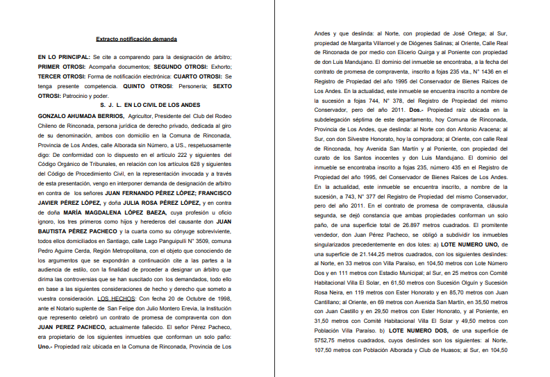 GONZALO AHUMADA BERRIOS, Agricultor, Presidente del Club del Rodeo Chileno de Rinconada, persona jurídica de derecho privado, dedicada al giro de su denominación, ambos con domicilio en la Comuna de Rinconada, Provincia de Los Andes, calle Alborada sin Número, a US., respetuosamente digo: De conformidad con lo dispuesto en el artículo 222 y siguientes del Código Orgánico de Tribunales, en relación con los artículos 628 y siguientes del Código de Procedimiento Civil, en la representación invocada y a través de esta presentación, vengo en interponer demanda de designación de ar?bitro en contra de los señores JUAN FERNANDO PÉREZ LÓPEZ; FRANCISCO JAVIER PÉREZ LÓPEZ, y doña JULIA ROSA PÉREZ LÓPEZ, y en contra