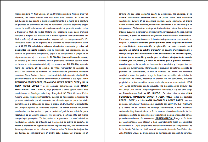 estipuló: “Cualquier dificultad que se produzca entre las partes en cuanto al cumplimiento, interpretación y ejecución de este contrato será resuelto en calidad de árbitro arbitrador en cuanto al procedimiento y fallo y sin que sus resoluciones sean susceptibles de recurso alguno, incluso los de casación y queja, por un árbitro designado de común acuerdo por las partes y a falta de acuerdo por la justicia ordinaria”. Atendido que en la especie se han suscitado conflictos y divergencias con ocasión del cumplimiento, interpretación y ejecución del referido contrato de promesa de compraventa, y con la finalidad de dirimir los conflictos suscitados entre las partes, surge la imperiosa necesidad de solicitar la designación de árbitro, mediante la citación de los comuneros, actuales propietarios de los inmuebles, a una audiencia para su nombramiento. POR TANTO, De conformidad con lo expuesto, y lo dispuesto en los artículo 1323 del Código Civil 227 del Código Orgánico de Tribunales, 414 y 680 del Código de Procedimiento Civil. A US. RUEGO, Se sirva citar a don JUAN FERNANDO, FRANCISCO JAVIER Y JULIA ROSA, todos de apellidos PEREZ LOPEZ y a doña MARIA MAGDALENA LÓPEZ BAEZA, los tres