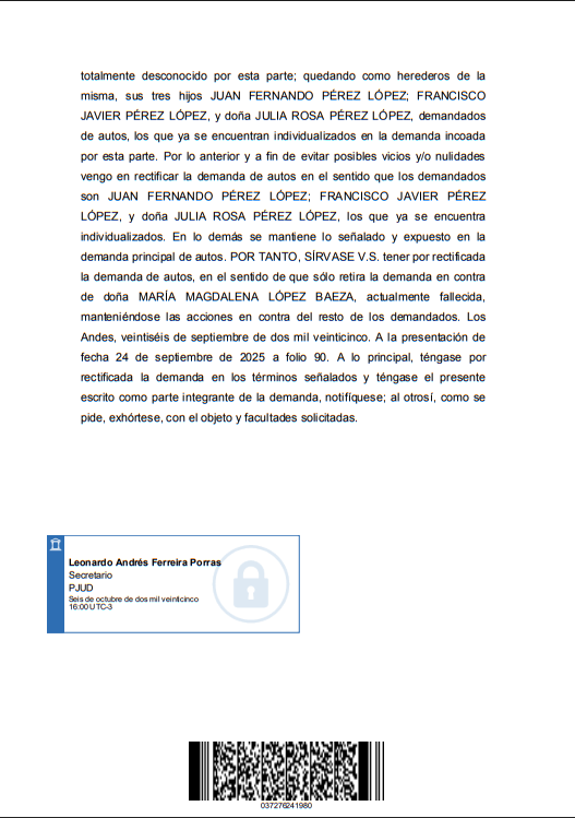 LÓPEZ, y doña JULIA ROSA PÉREZ LÓPEZ, los que ya se encuentra individualizados. En lo demás se mantiene lo señalado y expuesto en la demanda principal de autos. POR TANTO, SÍRVASE V.S. tener por rectificada la demanda de autos, en el sentido de que sólo retira la demanda en contra de doña MARÍA MAGDALENA LÓPEZ BAEZA, actualmente fallecida, manteniéndose las acciones en contra del resto de los demandados. Los Andes, veintiséis de septiembre de dos mil veinticinco. A la presentación de fecha 24 de septiembre de 2025 a folio 90. A lo principal, téngase por rectificada la demanda en los términos señalados y téngase el presente escrito como parte integrante de la demanda, notifíquese; al otrosí, como se pide, exhórtese, con el objeto y facultades solicitadas. |