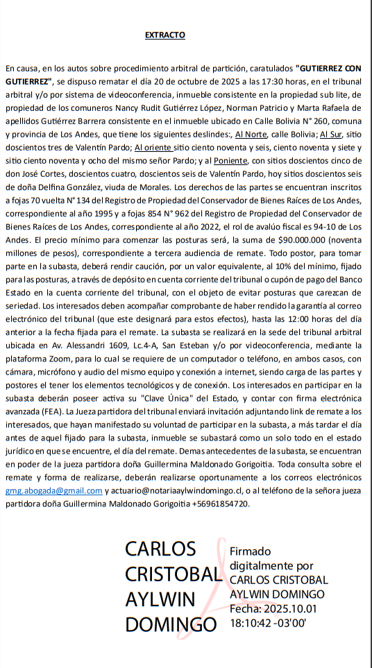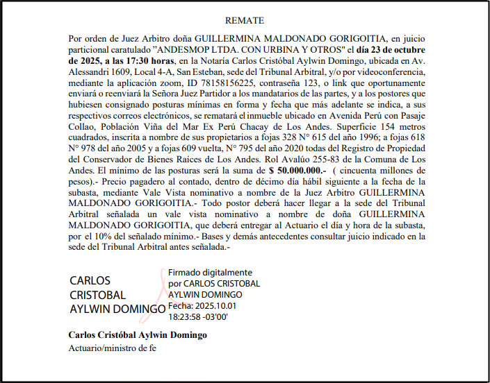 Por orden de Juez Arbitro doña GUILLERMINA MALDONADO GORIGOITIA, en juicio particional caratulado ”ANDESMOP LTDA. CON URBINA Y OTROS" el día 23 de octubre de 2025, a las 17:30 horas, en la Notaría Carlos Cristóbal Aylwin Domingo, ubicada en Av. Alessandri 1609, Local 4-A, San Esteban, sede del Tribunal Arbitral, y/o por videoconferencia, mediante la aplicación zoom, ID 78158156225, contraseña 123, o link que oportunamente enviará o reenviará la Señora Juez Partidor a los mandatarios de las partes, y a los postores que hubiesen consignado posturas mínimas en forma y fecha que más adelante se indica, a sus respectivos correos electrónicos, se rematará el inmueble ubicado en Avenida Perú con Pasaje Collao, Población Viña del Mar Ex Perú Chacay de Los Andes. Superficie 154 metros cuadrados, inscrita a nombre de sus propietarios a fojas 328 N° 615 del año 1996; a fojas 618 N° 978 del año 2005 y a fojas 609 vuelta, N° 795 del año 2020 todas del Registro de Propiedad del Conservador de Bienes Raíces de Los Andes. Rol Avalúo 255-83 de la Comuna de Los Andes. El mínimo de las posturas será la suma de $ 50.000.000.- ( cincuenta millones de pesos).- Precio pagadero al contado, dentro de décimo día hábil siguiente a la fecha de la subasta, mediante Vale Vista nominativo a nombre de la Juez Arbitro GUILLERMINA MALDONADO GORIGOITIA.- Todo postor deberá hacer llegar a la sede del Tribunal Arbitral señalada un vale vista nominativo a nombre de doña GUILLERMINA MALDONADO GORIGOITIA, que deberá entregar al Actuario el día y hora de la subasta, por el 10% del señalado mínimo.- Bases y demás antecedentes consultar juicio indicado en la sede del Tribunal Arbitral antes señalada.- |