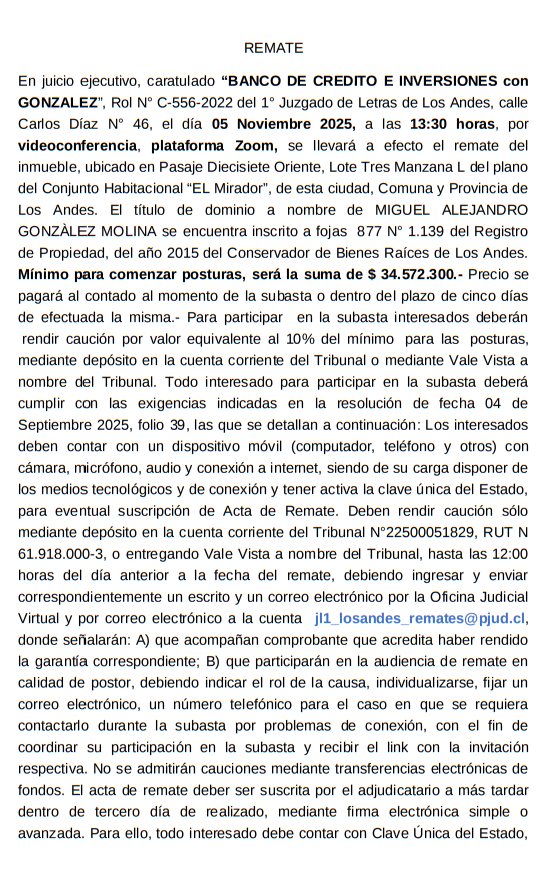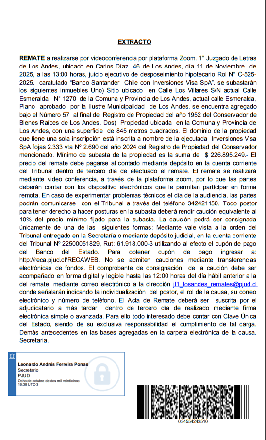 Remate en juicio ejecutivo, caratulado Abogados e Inversiones Díaz y Compañía Limitada con Zuma Inmobiliaria Limitada, Rol C-1367-2024, 2° Juzgado de Letras de Los Andes, el día 27 de noviembre de 2025, 13:00 horas, por videoconferencia, plataforma Zoom, se llevará a efecto el remate del inmueble, ubicado en la comuna de San Esteban consistente en la Parcela P – SIETE, resultante de la subdivisión de un inmueble ubicado en San Francisco, comuna de San Esteban, Provincia de Los Andes, individualizada en el plano protocolizado bajo el número 233 al final del Registro de Propiedad del año 1996, de un superficie de cero coma quinientas dos hectáreas. El título de dominio a nombre de Zuma Inmobiliaria Limitada se encuentra inscrito a fojas 2683 N° 3050 del Registro de Propiedad del año 2023 del Conservador de Bienes Raíces de Los Andes. Mínimo para comenzar posturas, será la suma de