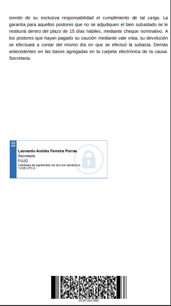 REMATE a realizarse por videoconferencia por plataforma Zoom. 1° Juzgado de Letras de Los Andes, ubicado en Carlos Díaz 46 de Los Andes, día 11 de Noviembre de 2025, a las 13:00 horas, juicio ejecutivo de desposeimiento hipotecario Rol N° C-525-2025, caratulado “Banco Santander Chile con Inversiones Visa SpA”, se subastarán los siguientes inmuebles Uno) Sitio ubicado en Calle Los Villares S/N actual Calle Esmeralda N° 1270 de la Comuna y Provincia de Los Andes, actual calle Esmeralda, Plano aprobado por la Ilustre Municipalidad de Los Andes, se encuentra agregado bajo el Número 57 al final del Registro de Propiedad del año 1952 del Conservador de Bienes Raíces de Los Andes. Dos) Propiedad ubicada en la Comuna y Provincia de Los Andes, con una superficie de 845 metros cuadrados. El dominio de la propiedad que tiene una sola inscripción está inscrita a nombre de la ejecutada Inversiones Visa SpA fojas 2.333 vta Nº 2.690 del año 2024 del Registro de Propiedad del Conservador mencionado. Mínimo de subasta de la propiedad es la suma de $ 226.895.249.- El precio del remate debe pagarse al contado mediante depósito en la cuenta corriente del Tribunal dentro de tercero día de efectuado el remate. El remate se realizará mediante video conferencia, a través de la plataforma zoom, por lo que las partes deberán contar con los dispositivo electrónicos que le permitan participar en forma remota. En caso de experimentar problemas técnicos el día de la audiencia, las partes podrán comunicarse con el Tribunal a través del teléfono 342421150. Todo postor para tener derecho a hacer posturas en la subasta deberá rendir caución equivalente al 10% del precio mínimo fijado para la subasta. La caución podrá ser consignada únicamente de una de las siguientes formas: Mediante vale vista a la orden del Tribunal entregado en la Secretaría o mediante depósito judicial, en la cuenta corriente del Tribunal Nº 22500051829, Rut: 61.918.000-3 utilizando al efecto el cupón de pago del Banco del Estado. Para obtener cupón de pago ingresar a: http://reca.pjud.cl/RECAWEB. No se admiten cauciones mediante transferencias electrónicas de fondos. El comprobante de consignación de la caución debe ser acompañado en forma digital y legible hasta las 12:00 horas del día hábil anterior a la del remate, mediante correo electrónico a la dirección jl1_losandes_remates@pjud.cl donde señalarán indicando la individualización del postor, el rol de la causa, su correo electrónico y número de teléfono. El Acta de Remate deberá ser suscrita por el adjudicatario a más tardar dentro de tercero día de realizado mediante firma electrónica simple o avanzada. Para ello todo interesado debe contar con Clave Única del Estado, siendo de su exclusiva responsabilidad el cumplimiento de tal carga. Demás antecedentes en las bases agregadas en la carpeta electrónica de la causa. Secretaria. |