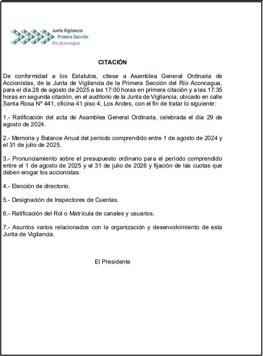 De conformidad a los Estatutos, cítese a Asamblea General Ordinaria de Accionistas, de la Junta de Vigilancia de la Primera Sección del Río Aconcagua, para el día 28 de agosto de 2025 a las 17:00 horas en primera citación y a las 17:35 horas en segunda citación, en el auditorio de la Junta de Vigilancia, ubicado en calle Santa Rosa Nº 441, oficina 41 piso 4, Los Andes, con el fin de tratar lo siguiente: