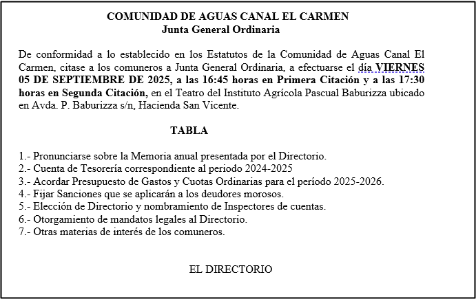 De conformidad a lo establecido en los Estatutos de la Comunidad de Aguas Canal El Carmen, citase a los comuneros a Junta General Ordinaria, a efectuarse el día VIERNES 05 DE SEPTIEMBRE DE 2025, a las 16:45 horas en Primera Citación y a las 17:30 horas en Segunda Citación, en el Teatro del Instituto Agrícola Pascual Baburizza ubicado en Avda. P. Baburizza s/n, Hacienda San Vicente.