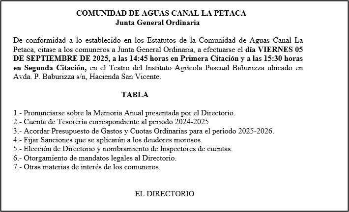 De conformidad a lo establecido en los Estatutos de la Comunidad de Aguas Canal La Petaca, citase a los comuneros a Junta General Ordinaria, a efectuarse el día VIERNES 05 DE SEPTIEMBRE DE 2025, a las 14:45 horas en Primera Citación y a las 15:30 horas en Segunda Citación, en el Teatro del Instituto Agrícola Pascual Baburizza ubicado en Avda. P. Baburizza s/n, Hacienda San Vicente.