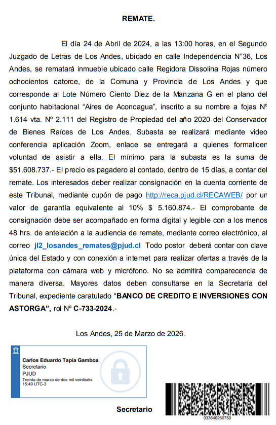 de Bienes Raíces de Los Andes. Subasta se realizará mediante video