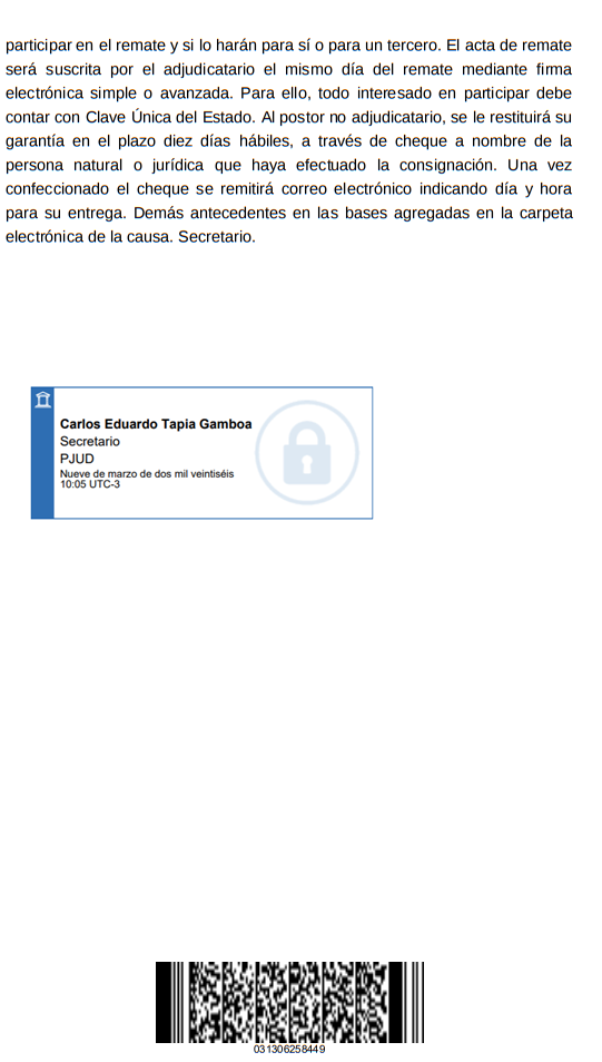 Tribunal o quien la subrogue certificará los postores que, habiendo cumplido con los requisitos señalados, pueden participar en el mismo. (8) El acta de remate deberá ser suscrita por el adjudicatario a más tardar dentro de tercero día de realizado, mediante firma electrónica simple o avanzada. Para ello, todo