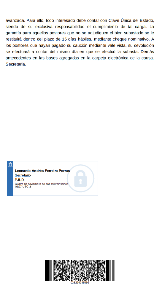 Remate. Ante el Segundo Juzgado Letras de Los Andes, ubicado en Av. Independencia 36, se subastará mediante videoconferencia a través de la plataforma Zoom, link de enlace, https://pjud-cl.zoom.us/j/97600178248?pwd=SMPeavtsH6Yb0HKco5bAlixTjL8u6d.1. ID de reunión: 97600178248 Código de acceso: 738441, el día 05 de diciembre de 2025, a las 13:00 horas, el LOTE NUMERO TRES resultante de la subdivisión de la Hijuela C, ubicada en la Comuna de Calle Larga, Provincia de Los Andes, individualizado en el plano que se encuentra agregado bajo el N° 1.071 al final del Registro de Propiedad del año 2009, a mi cargo, de una superficie de ochocientos cuarenta y ocho coma seis metros cuadrados. La propiedad se encuentra inscrita a nombre del demandado a Fs.2005 N°2530 del Registro de Propiedad de 2015 del Conservador de Bienes Raíces de Los Andes. El mínimo para las posturas será la suma de $22.089.829. Precio pagadero al contado dentro de quinto día hábil desde la fecha del remate. Para tener derecho a participar en la subasta y hacer posturas, los interesados deberán rendir caución por un valor equivalente al 10% del mínimo establecido para la subasta. La caución fijada deber ser consignada en la cuenta corriente de este Tribunal, mediante depósito en caja con cupón de pago (NO TRANSFERENCIA ELECTRÓNICA) bajo los siguientes datos: Segundo Juzgado del Letras de Los Andes. - Cuenta Corriente Banco del Estado N° 22500056405 - R.U.T. 60.305.014-2, para obtener cupón de pago ingresar a: http://reca.pjud.cl/RECAWEB/. El comprobante de consignación de la caución debe ser acompañado con a los menos 48 hrs. de antelación a la audiencia de remate, en la forma establecida en el artículo 6 del acta 263-2021, esto es, mediante el módulo especialmente establecido al efecto en la Oficina Judicial Virtual, individualizándose el postor en dicho módulo e indicando el rol de la causa en la cual participar, correo electrónico y un número telefónico para el caso en que se requiera contactarlo durante la subasta. Para efectos de dar cumplimiento al deber de consulta previsto en el artículo 29 de la Ley 21.389, que crea el Registro Nacional de Deudores de Pensiones de Alimentos, todo postor deber remitir un correo electrónico jl2_losandes@pjud.cl con copia a jl2_losandes_remates@pjud.cl , en la oportunidad en la que acompaña el comprobante de caución, individualizarse con su nombre, rut, profesión u oficio, domicilio y, señalar además, sí participara en el remate con el fin de adjudicarse para sí o para un tercero, en este último caso deber consignar el nombre, rut, profesión u oficio y domicilio del tercero.. Demás información en el juicio. Causa Rol C-2059-2023, caratulada COOPERATIVA DE AHORRO Y CREDITO COOPEUCH/CONCHA. Juicio Ejecutivo. El secretario. |