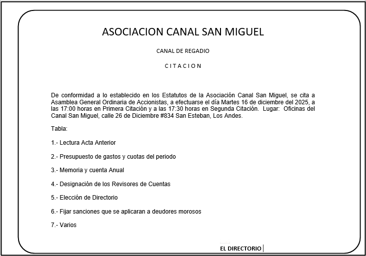 De conformidad a lo establecido en los Estatutos de la Asociación Canal San Miguel, se cita a Asamblea General Ordinaria de Accionistas, a efectuarse el día Martes 16 de diciembre del 2025, a las 17:00 horas en Primera Citación y a las 17:30 horas en Segunda Citación. Lugar: Oficinas del Canal San Miguel, calle 26 de Diciembre #834 San Esteban, Los Andes.
