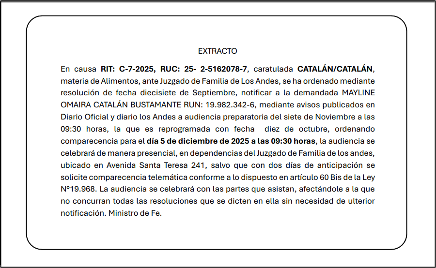 materia de Alimentos, ante Juzgado de Familia de Los Andes, se ha ordenado mediante