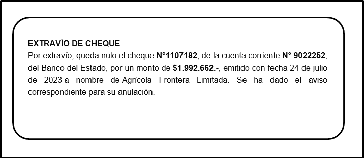 Por extravío, queda nulo el cheque N°1107182, de la cuenta corriente N° 9022252, del Banco del Estado, por un monto de $1.992.662.-, emitido con fecha 24 de julio de 2023 a nombre de Agrícola Frontera Limitada. Se ha dado el aviso correspondiente para su anulación. |