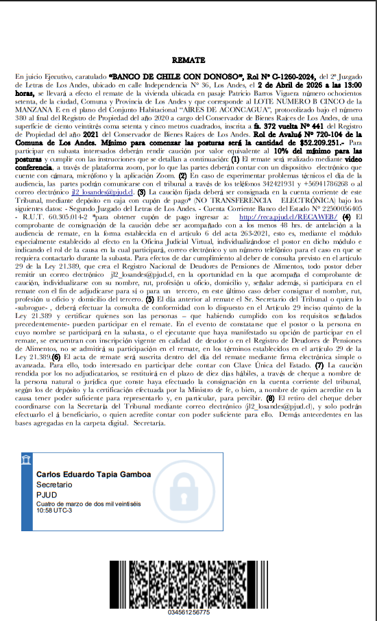 En juicio Ejecutivo, caratulado “BANCO DE CHILE CON DONOSO”, Rol Nº C-1260-2024, del 2º Juzgado de Letras de Los Andes, ubicado en calle Independencia N° 36, Los Andes, el 2 de Abril de 2026 a las 13:00 horas, se llevará a efecto el remate de la vivienda ubicada en pasaje Patricio Barros Viguera número ochocientos setenta, de la ciudad, Comuna y Provincia de Los Andes y que corresponde al LOTE NUMERO B CINCO de la MANZANA E en el plano del Conjunto Habitacional “AIRES DE ACONCAGUA”, protocolizado bajo el número 380 al final del Registro de Propiedad del año 2020 a cargo del Conservador de Bienes Raíces de Los Andes, de una superficie de ciento veintitrés coma setenta y cinco metros cuadrados, inscrita a fs. 372 vuelta N° 441 del Registro de Propiedad del año 2021 del Conservador de Bienes Raíces de Los Andes. Rol de Avaluó N° 720-104 de la